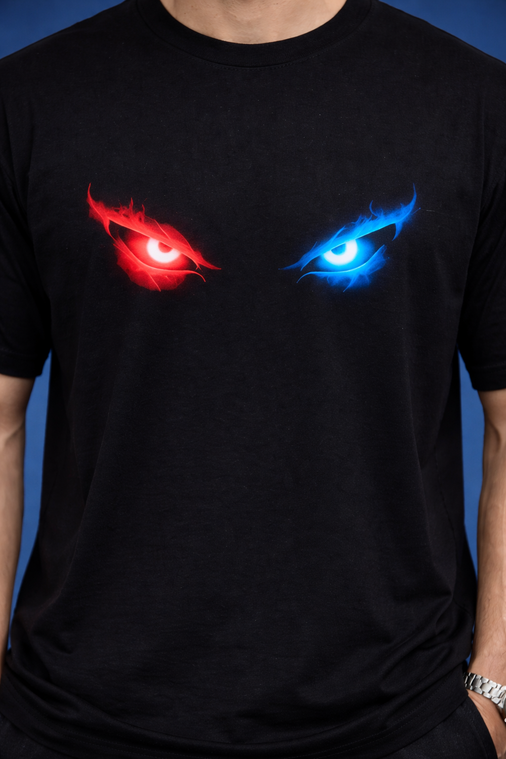 Dual Flame Eyes Graphic T-Shirt – Red Blue Neon Streetwear Tee